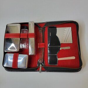 Chrome and clear plastic holders for bar soap, toothbrush, and a chrome hairbrush make this kit shine, while a glass mirror and glass bottle for your favorite after shave speak to times gone by.