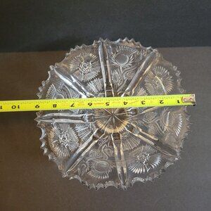 This elegant bowl showcases intricate floral thistle designs with scalloped edges. The clear pressed glass adds a timeless touch, ideal for display or serving.