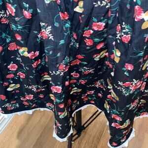 Vintage high waisted A-line midi calf length floral & hat all over print pleated artisan skirt w/ lace hem. No tags, so could have been handmade. Zipper & clasp up back. Lightweight.