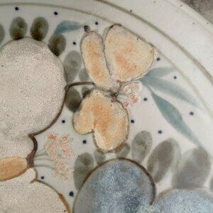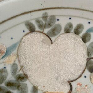 Heavy round stoneware bowl with hand painted abstract floral pattern made in Scotland in the late 20th century.