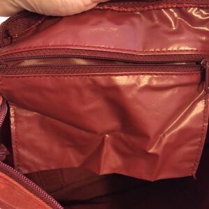 Vintage Highlights fir Children red fabric tote bag with double handle. Zipper close and one zipper side pocket inside. Bottom zippered compartment and one open pocket on front. Measurements are 14” wide x 20” tall.
