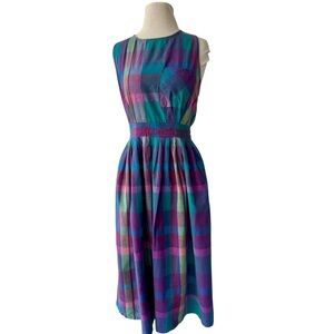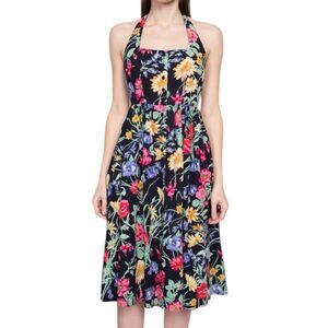 Charming red Hawaiian dress with mini ditsy blue, pink, yellow and white floral pattern.