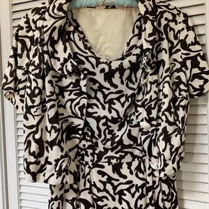 cotton fabric in apple red with mini hearts and floral, elastic cuffs at 3/4 sleeves, ruffle at hem, covered buttons at ruffle neck, ruffled yoke in front and back.