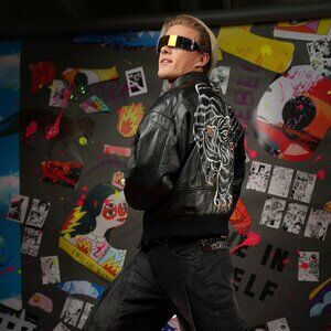A true statement piece with a story. This vintage black leather jacket by Hill & Archer (Made in Korea) has been reimagined with hand-painted artwork by our in-house SPARK + REBEL artist.