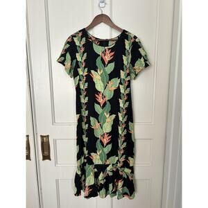 Vintage Hilo Hattie Floral Tropical Midi Dress Womens Size Medium Black Vacation
