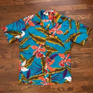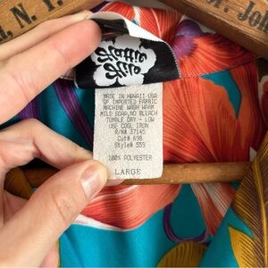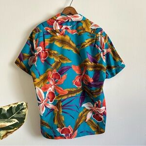 Beautiful vintage 80's/early90's Hilo Hattie Hawaiian shirt in a jewel-toned color palette and beautiful all-over print. Lightweight polyester material, matching turquoise buttons down the front, single patch-style chest pocket, wide, camp collar design. In great vintage condition with little wear, and a few tiny spots shown in photos but no major damage, staining or holes. Marked a men's size large and fits true to size, but please read measurements to ensure the right fit. Machine washable, single stitch, made in USA.