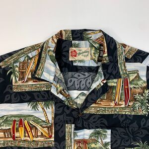 VINTAGE HILO HATTIE HAWAIIAN SHIRT MENS S SMALL BLACK BUTTON UP SURF SHACK HUT