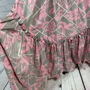Purchased in Kauai at a gift shop by my mother. The bottom ruffle looks like it has light stains but I believe it is the materials, purchased this way. . You have to really look to see it with the amount of material there is.