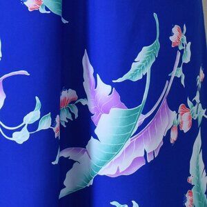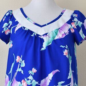Royal blue with white trim and neckline. Multi-color floral print.