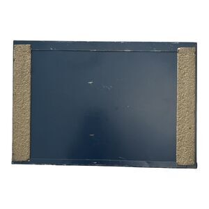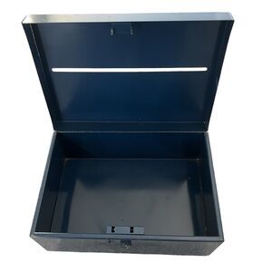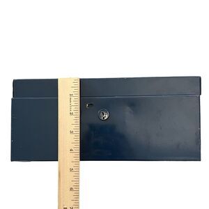 Some imperfections in the blue coating all around the box, as shown in photos. Box opens with the lever; there is a keyhole but no key. Remnants of the adhesive that kept this box on the counter of the hotel on the back - actually a good thing, as it keeps the box cushioned on any surface you put it on.