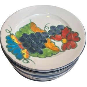 This set of eight Himark 8-inch plates showcases a stunning hand-painted grape and floral design, signed by the artist, Celina. Crafted from terra cotta red clay, these plates embody the rustic charm and artistry of vintage Portuguese dinnerware. Intricate hand-painted details, making these plates a lovely addition to any collection or table setting.