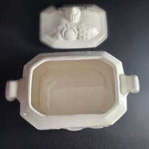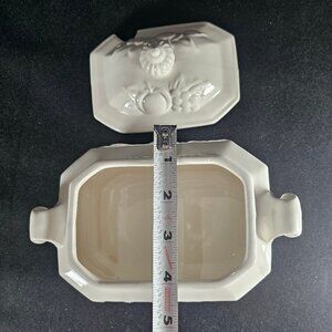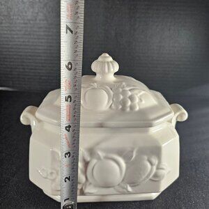 Rare Find: This item is hard to come by. This beautiful Himark gourmet kitchen Tureen is the perfect addition to your dinnerware collection. A medium sized Tureen comes with a lid and has a pretty embossed fruit design, making it perfect for serving soups or stews. The glaze finish in white color gives it a vintage classic look that is sure to impress your guests. Crafted from high quality ceramic in porcelain. This soup tureen is not only stylish but also durable. In excellent condition, with no damages, it holds a quart of liquid. Its 7.5 inches long from handle to handle, 4.5 inches wide, 4 inches high without lid and 6.5 inches tall with lid. Opening is 3 inches wide by 4.5 inches long. Made in Japan. No ladle. Non smoking pet free home.