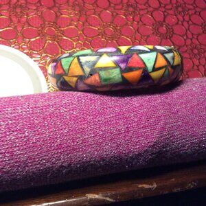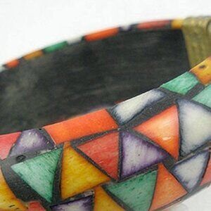 Here is a vintage from the 1970s colorful Hindu Indian bone hinged multicolored mosaic cuff bangle bracelet. It is a very colorful bracelet with a mosaic of fitted triangular pieces of dyed bone inlaid into black. It is made of bone, brass, wood, and resin. The triangles are dyed in a range of bright colors; predominately orange, red, golden yellow, green and white with some purple and a few blue. The ends are capped with stamped brass, a hint on one side and pin closure on the other. It has some wear to one side, and to the painting on the inside(see last 2 pics), otherwise it is in very good condition. I have never worn it.