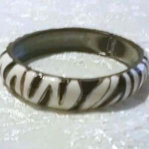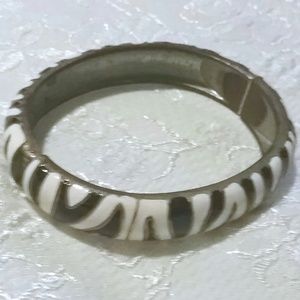 This bangle bracelet is done in a black and white zebra enameled design. The bracelet measures 2 3/8" from side to side, 2" from front to back and is 1/2" in width. Enamel is in good condition but there is wear to the metal finish on the inside. Please see pics!