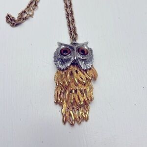 Here is a Vintage Hinged Owl necklace with glass eyes 24” chain in EUC