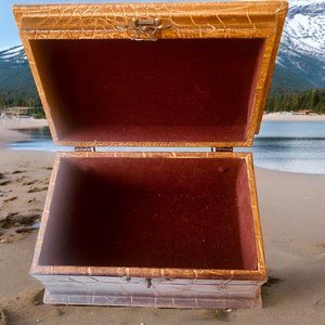 Vintage hinged wooden box with leather overlay. The leather has a croc print or possibly is crocodile. Metal top handle. Burgundy felt lined. SLOPED SIDES!