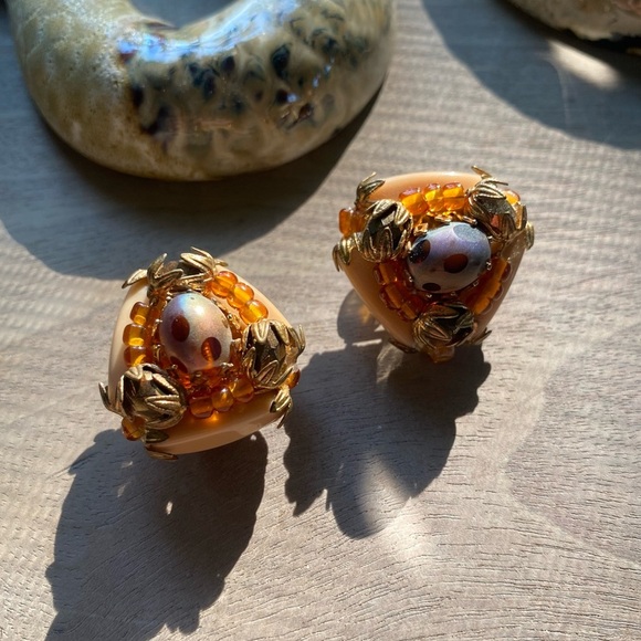 Vintage Hobé Amber Glass Bead and Lucite Clip On Triangle Earrings