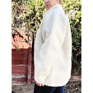 This vintage Michael Hoban Sherling pullover jacket is designed in an ivory faux sherling material, featuring a drawstring closure and an overcoat style. It is a size XL and is brand new with tags, making it a deadstock item. This classic piece, made in Hong Kong, is perfect for travel or casual wear, adding a touch of vintage style to any outfit.