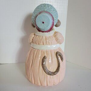 This charming vintage ceramic cow cookie jar adds a whimsical touch to the kitchen. Its delightful bonnet and colorful floral details make it a captivating centerpiece. Store cookies or other treats in style while showcasing this unique collectible that effortlessly blends functionality with artful design.