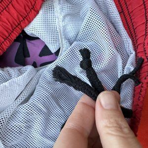 Good condition. No holes or stains. Elastic is in good condition. No dry rot. Elastic/drawstring waist. Some fraying to end of drawstring. Lined. Laid flat, waist measures 16 inches and inseam is 5 inches. Pockets at hip.