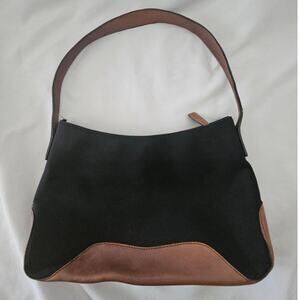 Vintage Hobo International Annapolis MD Black Fabric Brown Leather Shoulder Bag. some condition from age/use as pictured. measurements are approximately: 11.5 x 8 x 3 inches.