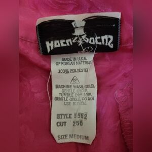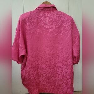 Vintage Hocus Pocus Of CA Vibrant Pink Casual Button Down Shirt Sz Medium; This casual button-down shirt features a vibrant pink hue, perfect for adding a pop of color to your wardrobe. Made from lightweight fabric, it offers comfort and style for warm weather occasions. The shirt's subtle textured pattern of some flowers adds a cute touch. Has shoulder pads. 100% polyester