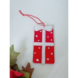 Santa figures with minor paint wear. Star ornament = 4 inches. Gift ornament = 4 inches.