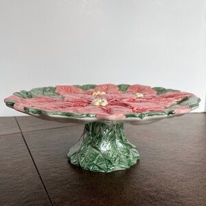 Beautiful Poinsettia Cake Stand by OCI Dining. H 4in x Diameter 10.5in. Raised dimensional floral design on top of stand. Coloring is gorgeous. Excellent condition, no noted defects. Price is for one, two are available. Rare find!
