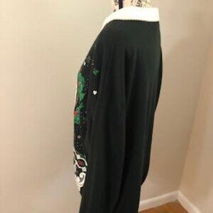 -This awesome sweater features an oversized circular holiday house print in white. Black with white, green, and red accents.