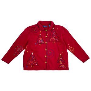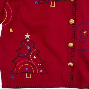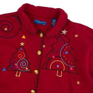 Vintage Holiday Cotton Jacket Button Front Christmas Tree Embellished Size P XL