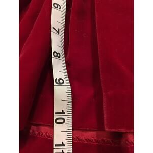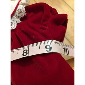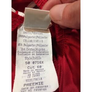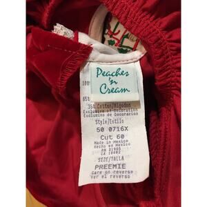 Tag states preemie. Measurements are 10” from shoulder to bottom, 9” pit to pit. Red velvet with embroidered Peter Pan collar. Back button closure. Unlined. GUC for some very light discoloration on collar at right top of embroidery. Peaches 'N Cream brand.