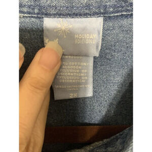Get into the holiday spirit with this vintage Holiday Editions denim button-up shirt. Featuring a collared neckline and long sleeves, this blue shirt is made of comfortable cotton material with embroidered accents of a classic snowman design. The button closure adds a touch of retro charm to this plus-size (2X) shirt, which is perfect for the winter and fall seasons. The shirt is a basic style with a Christmas, holiday, snowman, and snowmen theme, making it a great addition to any festive outfit.