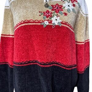 ✨ Vintage Alfred Dunner embroidered holiday sweater in size Large. This cozy chenille knit features bold horizontal color blocking in cream, tan, festive red, and black — finished with delicately embroidered poinsettia flowers at the shoulder for a subtle Christmas touch. The quarter-zip front with an ornate floral zipper pull adds a charming, vintage-inspired detail.