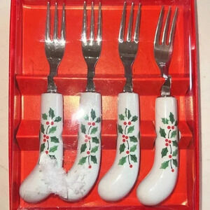 Vintage Holiday Holly Berry Christmas New Year’s Eve Cocktail Forks Set of 4 NWOT Stainless steel, ceramic handles, Made in Japan Have never been used!! Comes in original box with plastic cover, which is in ok condition.