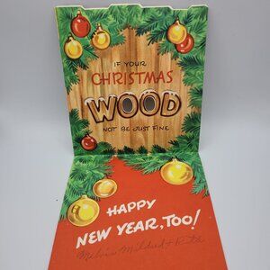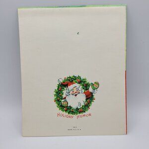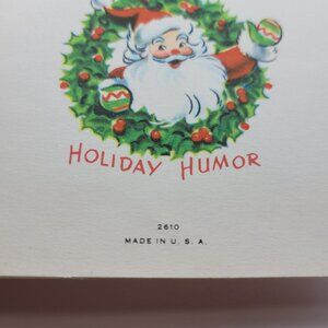 This vintage Christmas card features a playful holiday humor design with vibrant colors and glitter accents. Ideal for collectors or spreading festive cheer. Made in the USA, it captures the spirit of a bygone era, perfect for nostalgic gift-giving or display.
