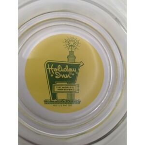Relive nostalgic memories with this charming Holiday Inn ashtray, a delightful piece of vintage Americana. The clear glass construction forms a clean, octagonal shape, allowing the iconic Holiday Inn logo to take center stage. Encased within a sunny yellow circle, the green retro sign evokes feelings of roadside adventures and family vacations. The classic "The World's Innkeeper" slogan adds to its nostalgic appeal. Perfect for adding a touch of retro flair to your home bar, office, or collection, or simply as a conversation starter, this ashtray brings a slice of mid-century hospitality into your everyday life.
