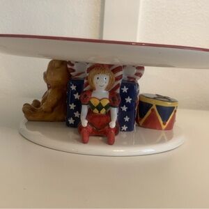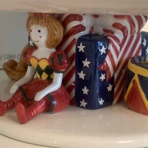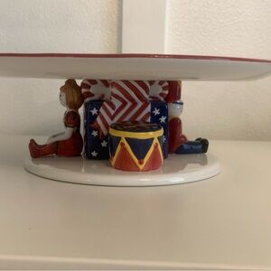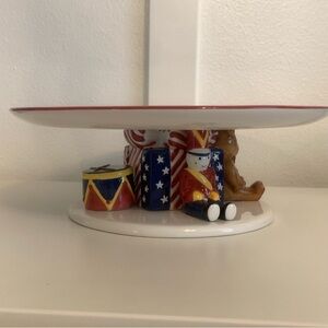 Charming cake stand with a toy soldier and drum design. Perfect for festive occasions. New in box.