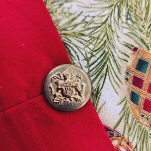 Possibly homemade pattern. Old fashion ornaments surrounded by pines. Each end has a military emblem button attached.