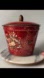 Vintage Holland Tea/Cookie Tin w Copper Finial Red Gold Floral Crackle
