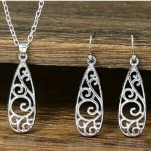 Vintage Hollow Water Drop Design matching Necklace and Earring Set – Silver Electro-Plated