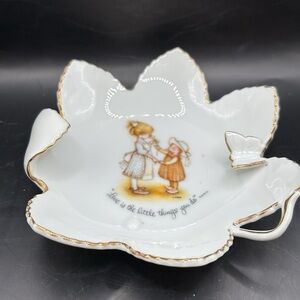 Vintage Holly Hobbie trinket dish White Decorative Leaf-Shaped Dish w/Gold Trim