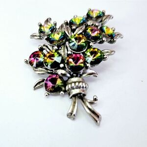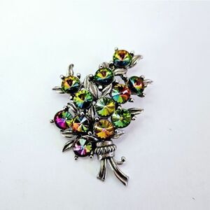 Vintage Hollycraft Watermelon Aurora Borealis Rivoli Rhinestone Bouquet Floral Brooch Pin