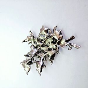 This is a beautiful Hollycraft brooch with watermelon rivoli rhinestones. This exquisite, statement piece is truly stunning with sparkling watermelon rhinestones set in a floral, silver tone background. The brooch measures 2.5 inches long and 1.5 inches wide. This brooch would be a perfect addition to any outfit as an accent piece. It is a classic, elegant, timeless style in excellent condition. It is unsiged.