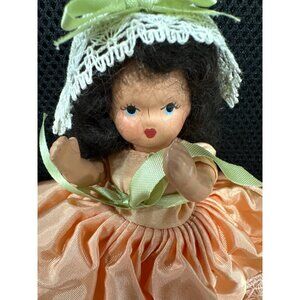 This doll is dressed to impress in peach perfection, complete with a lace bonnet and a storybook to boot. A touch of whimsy for those who appreciate retro flair.