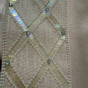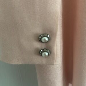 Vintage Hollywood by Nolan Miller Designer for TV, and to the stars including Sophia Loren, Joan Collin’s & Elizabeth Taylor. Well made with intricate pearl, rhinestone, clear beading with iridescent sequence. Cuffs have two pearl and rhinestone beads. Open Cascade front, padded shoulders, and front pockets.