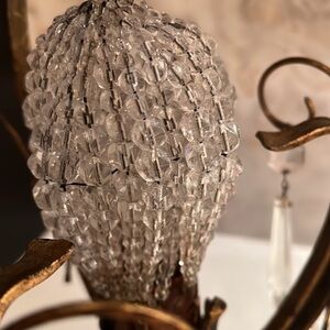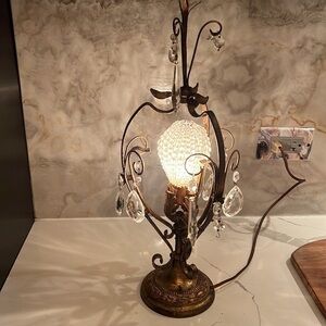 This is a beautiful working Vintage Hollywood Regency 18” Table Lamp Glass Prism Tole Metal - Gold Gilt. Miscellaneous crystals not all the crystals exactly match in the clusters, but these are easy to get and match. Electrical works perfectly. 21” circumference.