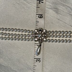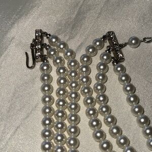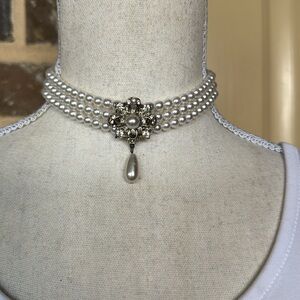 For a Hollywood evening look, add layers of pearls! Choker Necklace features three cream pearl strands with a beautiful diamante/pearl vintage design at the center. Adjustable length.