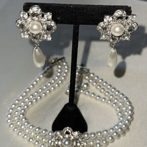 Vintage Hollywood Regency 50s Rhinestone & Pearl Choker Necklace Earrings Set