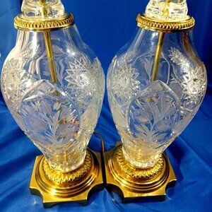 Add a touch of vintage glamour to your home with this set of two Hollywood Regency style tiered buffet table lamps. These lamps feature a stunning combination of brass and intricately cut lead crystal, giving them a luxurious and elegant look. The gold color of the lamps adds a warm and inviting feel to any room. With a unique knob control style and measuring 25.5" in height, these lamps are perfect for any unisex adults' room. The lamps are corded and have a power source that will complement any room's decor. These original vintage lamps were manufactured in the 1970s, making them a rare find for collectors.