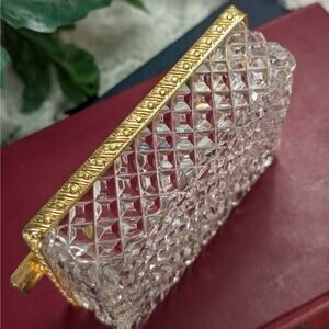 Diamond point crystal vintage ashtray or trinket dish with polished brass edging. This vintage crystal tray is so elegant! The piece is decorated in a geometric pattern of faceted diamond buttons with a scrolling leaf design on the polished brass banding. Not only does this function as a very elegant ashtray, it would be a great tray to store a few pieces of special jewelry, brooches, pins or cufflinks, or even coins. It is both handsome and functional and would make a great gift!